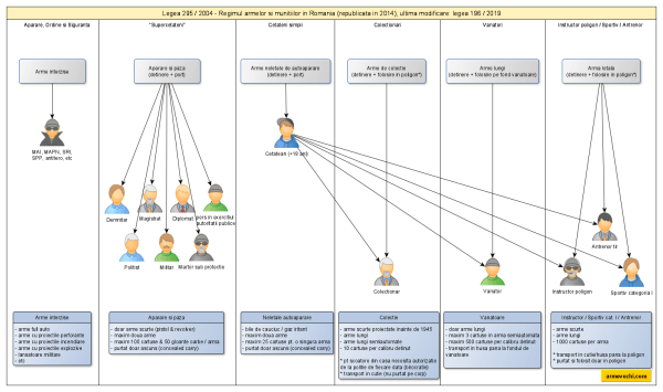 O scurta prezentare a categoriilor de persoane ce au dreptul sa detina arme de foc in Romania, cate arme si cata munitie, dar si in ce fel au dreptul de a folosi, purta sau transporta arma si munitia. Sinteza extrasa din legea 295/2004 privind regimul armelor, componentelor esentiale si al munițiilor.