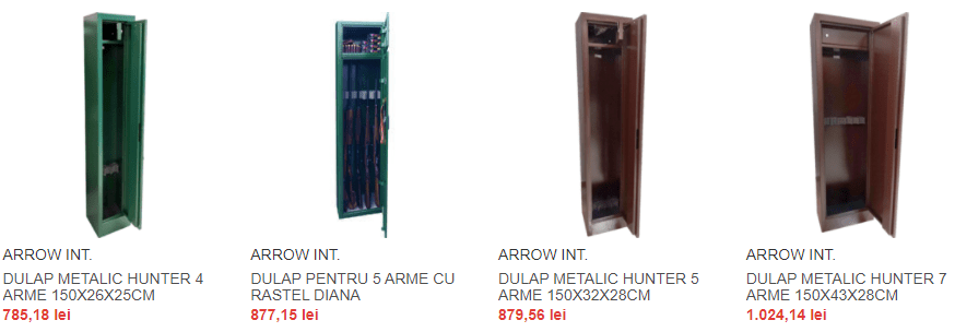 Pretul difera destul de mult in functie de marimea dulapului. Pe la 700-800 ron gasim dulapuri pentru 4 sau 5 arme, iar la 1000-1500 gasim dulapuri pentru 5, 7 sau chiar 11 arme. Dulapuri de aceste marimi se gasesc la Arrow, Armis-Instinct, pe e-Mag, la magazinele de vanatoare si pescuit sau chiar la Decathlon. Mai sunt si variante mai scumpe pe la 2500-3500 de ron. De asemenea si cei de la Trezzor (Ungaria) produc niste dulapuri interesante si am inteles ca le si livreaza in Romania (o data pe luna).