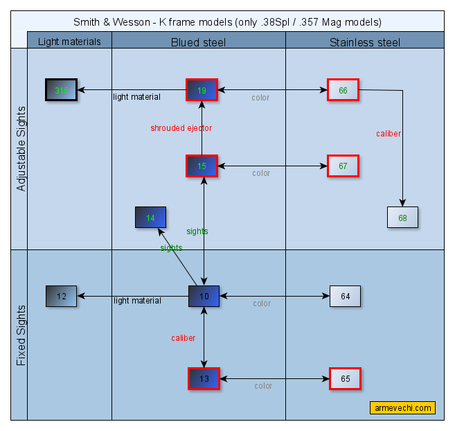 Acest material incearca sa organizeze modelele in calibrul .38 Special si .357 Magnum construite pe baza platformei K frame, toate in actiune dubla si sa prezinte relatia dintre aceste modele. Ma voi folosi initial de diagrama realizata de catre cei de la Lucky Gunner si desi exista mai multe dimensiuni pe care le-am putea organiza, noi le vom imparti dupa tipul catarilor: fixe sau ajustabile. La mijlocului articolului puteti vizualiza o diagrama realizata de noi, care imparte modelele K frame pe mai multe dimensiuni: tip catari, tip material, culoare si calibru.