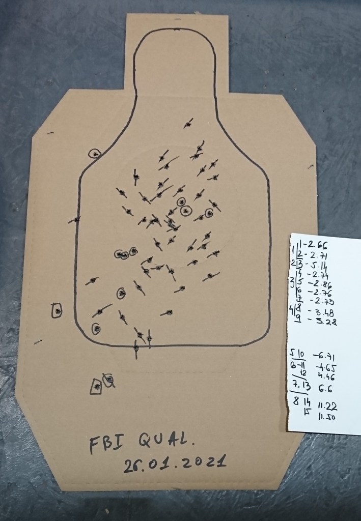 - Nota personala: La mine ori s-au aliniat planetele de aceasta data si m-am incadrat in timp fara sa pierd puncte, ori chiar a contat foarte mult ca am invatat din greseala de la prima secventa din stagiul 4. De asemenea acum 6 saptamani cand am mai executat acest FBI qualification am avut minus 3 puncte la stagiul 5 care nici macar nu au fost aproape de conturul siluetei, au lovit chiar marginea tintei de IDPA (poza tinta).