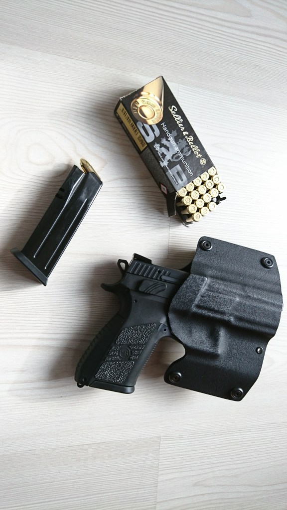 Sesiunea am realizat-o folosind un pistol CZ P07 (polimer, cu cocos, marime compacta, aceeasi marime cu Glock 19) dintr-un toc exterior pe curea, realizat de Mircea Nedelea. Munitia folosita a fost Sellier & Bellot 9x19mm de 115 grains, sau 7.5 grame. Am inceput fiecare secventa fara glont pe teava si am armat evident la fiecare scoatere din toc. Ce am facut eu diferit fata de standardul oficial, este ca arma era la vedere nu era ascunsa vederii. Dupa cum se observa si din video la stagiul 8 am avut un incident si am pierdut un foc, deoarece aveam in incarcator exact cat era necesar stagiului. Evident sesiunea a fost executata in prezenta unui instructor autorizat!!!