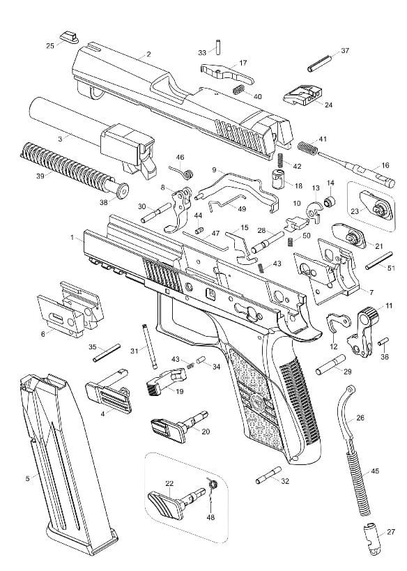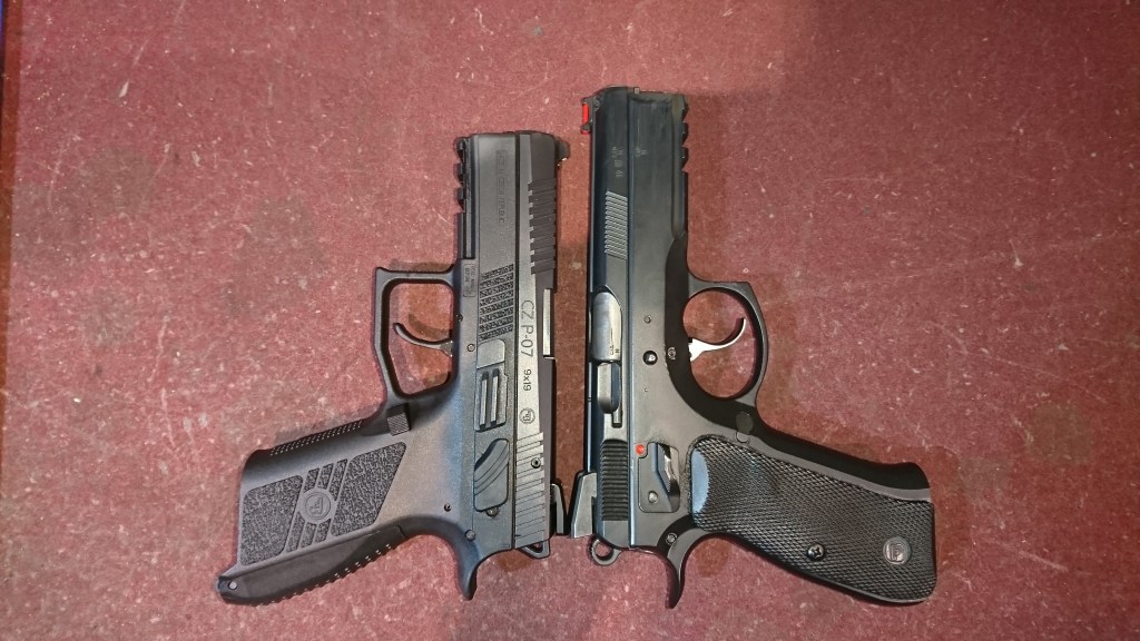 CZ P-07 este un pistol compact cu corpul din polimer, care are sistem de tragere cu cocos (hammer fired) si tragaci in SA/DA. Sistemul de siguranta instalat din fabrica este de dip decocker only (dezarmator fara siguranta activa), dar impreuna cu pistolul vin si piese de schimb de tip safety care se pot instala in locul decockerului. Teava este scurta, in mod oficial are 95mm, dar la o masuratoare fizica are 91 mm. Sistemul de ochire are catarea si inaltatorul din metal, iar ambele se pot schimba cu alte modele. Scopul principal al acestui pistol este de a fi purtat pentru aparare (self defense, aparare si paza) si are o siguranta interna ce il face sa nu traga singur daca este scapat pe jos si se loveste cocosul (firing pin block). In acest material voi vorbi doar despre aspecte fizice si practice, istoria CZ si evolutia platoformei CZ 75 a fost deja acoperita in prima parte a prezentarii pistolului CZ Shadow 2.