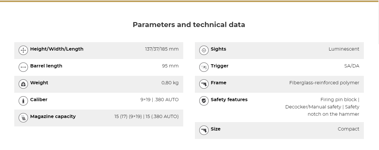 Conform specificatiilor oficiale pistolul se incadreaza la limita in divizia CCP (Compact Carry Pistol) de la competitia IDPA, singura masuratoare care este problematica fiind latimea datorita faptului ca pistolul are comenzile sigurantei/decockerului ambidextre. Dar daca se ajusteaza putin prin pilire partea nefolosita (dreapta de exemplu) si se reduce maneta decockerului de pe dreapta cu ~2 mm, atunci pistolul ar incape in cutia de CCP. Inteleg ca ar exista si piese aftermarket mai inguste, dar eu nu am gasit.