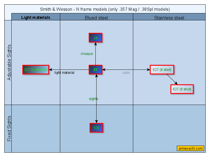 Astazi in productie si disponibile pe pagina oficiala S&W gasim modelele: 27, 627 (8 shot), 327 SC si 327 TRR8.