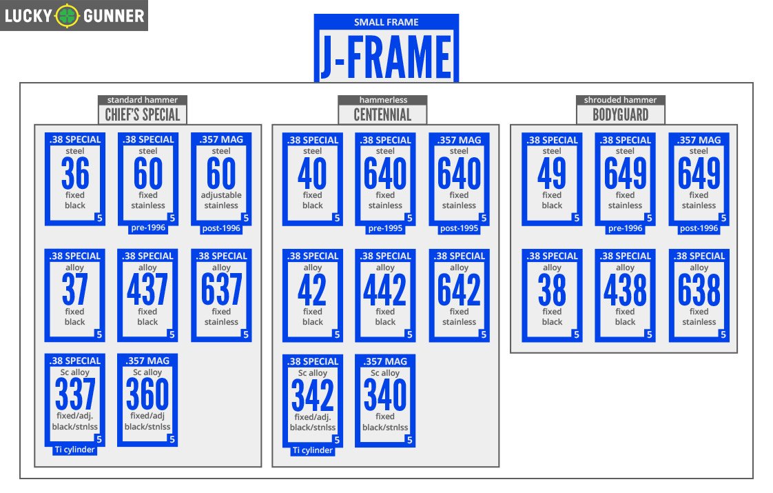 Avand de-a face cu foarte multe modele, acestea sunt greu de organizat pentru o prezentare usor de urmarit. Avem mai multe dimensiuni pe care am putea sa le impartim: materialul din care este realizat corpul, actiunea cocosului, calibrul si tipul catarilor. Spre deosebire de K, L si N frame unde tipul catarilor si calibrul au fost dimensiunile principale dupa care le-am impartit, la J frame este mai natural sa le impartim dupa: actinea cocosului si materialul din care este realizat corpul revolverului. Astfel avem cele trei linii principale: