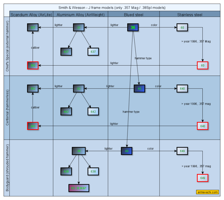Acest material incearca sa organizeze modelele de revolvere Smith & Wesson in actiune simpla-dubla, in calibrul .38 Special si .357 Magnum construite pe baza platformei J frame, iar pentru aceasta ma voi folosi initial de diagrama realizata de catre cei de la Lucky Gunner. La mijlocul materialului gasiti o diagrama ArmeVechi cu relatia dintre modelele prezentate aici. Materiale similare gasiti si despre platforma K frame, platforma L frame si platforma N frame.
