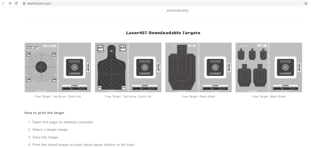 Pe langa aplicația de pe telefon, mai sunt necesare țintele standardizate. Aplicația poate recunoaște o serie de forme ca tinte. Acestea se pot downloada de pe site-ul aplicației: https://www.laserhit.com/targets si se pot imprima pe hartie obișnuita. Mărimea țintei imprimate poate diferi, simuland diferite distanțe de tragere. O mărime de aproximativ 10 centimetri a țintei simulează o distanța de tragere de circa 25 metri de la 2 metri.