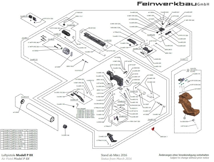 P8X is the last in a long line of air pistols made by Feinwerkbau. A lists that starts in 1965 with the model 65 and then 80 and 90 that were springers, continues with the models 100, 102 and 103 that were SSPs, the models C10, C20 and C25 on CO2 and at the end with the models P30, P34, P40, P44 and P8X that are PCPs.
