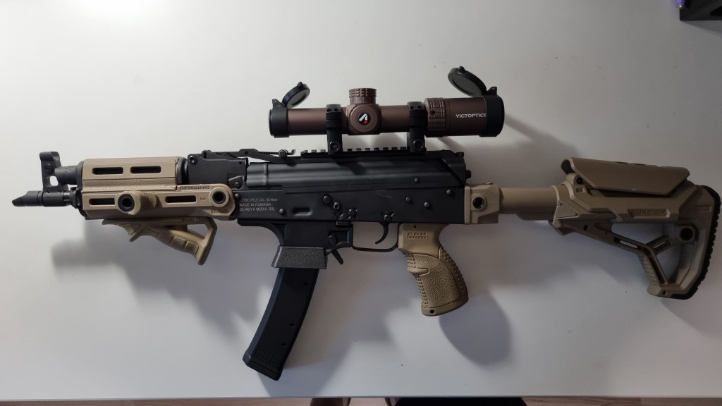 Pe arma se poate monta mobilier standard AKM. Cand am cumparat-o, era in varianta CTS9C, adica clasic –  cu mobilier de lemn. Am achizitionat separat mobilier de AKM de la FAB Defense pentru ca am vrut alta culoare si s-a potrivit perfect. Exista si modelul CTS9T care vine dotat cu mobiler din polimer negru.