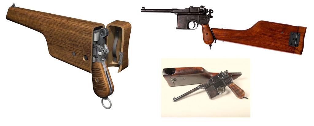 A doua idee e cea a pistolului cu pat. Inca de la revolverele cu pulbere neagra Colt intalnim modalitati de a fixa un pat la arma de mana pentru a imbunatati stabilitatea si deci precizia la distanta. Primele pistoale semiautomate, cum ar fi Mauser C96 si Luger, aveau intergrate piesele necesare pentru fixarea patului. Ba chiar la C96 patul detasabil servea ca si toc.