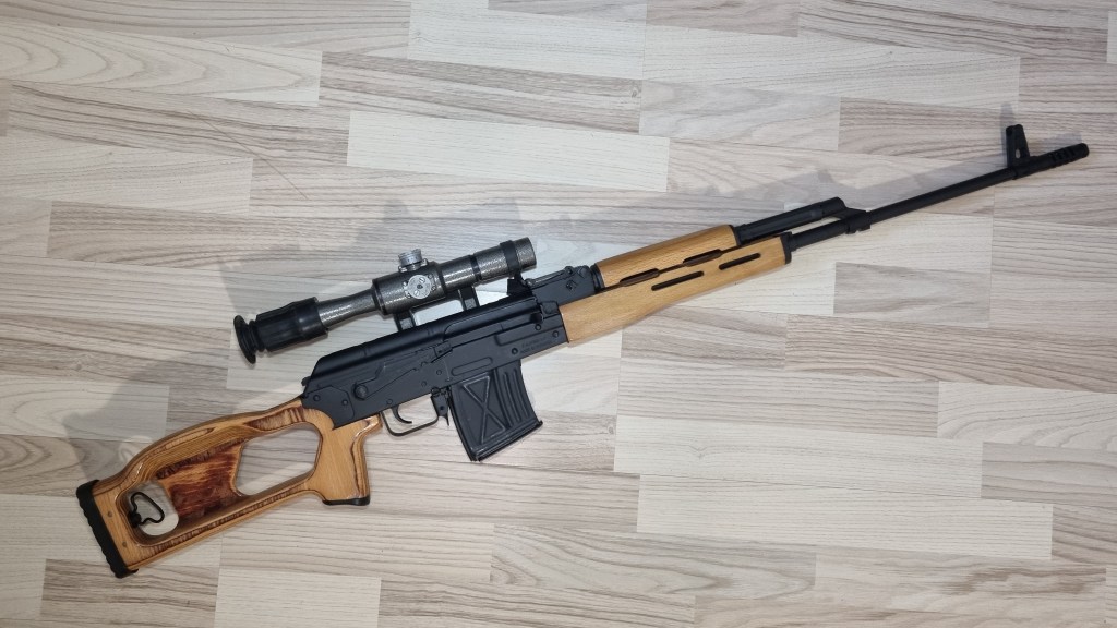 Un alt element caracteristic al PSLului este incarcatorul. Bineinteles este mult mai lat decat cel de la AK. Este bifilar si contine maxim 10 cartuse. Si are acest X pe partile laterale. Acesta este un semn foarte distinctiv pentru PSL care se observa usor de la distanta mare. Daca are X e PSL, daca are o vafa, e Dragunov.
