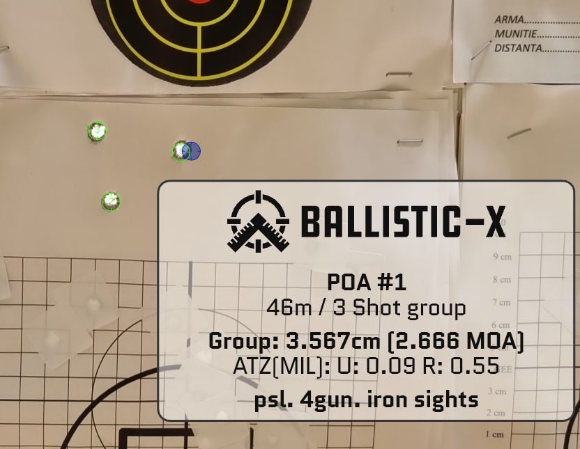 Prima data se trage pe aparatele mecanice setate pe pozitia 3, tintind mijlocul laturii de jos a dreptunghiului, apoi cu luneta tot pe pozitia 3, cate 4 focuri. Ambele trageri trebuie sa intre intr-un cerc cu diametrul de 8 cm, iar punctul median al loviturilor trebuie sa fie la 14 cm deasupra punctului de ochire.
